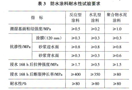 对长期浸泡水中或耐久性要求较高的地下工程所采用的防水涂料,除按有关标准进行一般检测外,还必须进行表3中的4项耐水性试验,即:浸水168 h后的拉伸强度;浸水168 h后的断裂伸长率;浸水168 h后的粘结强度保持率;浸水168 h后的抗渗性的保持率。以上要求虽是《地下工程防水技术规范》的规定,对于长期浸泡水的工程亦应作此测试,以满足工程使用要求。