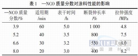 3结果与讨论 3.1异氰酸酯质量分数对涂料性能的影响 甲组分中异氰酸酯(—NCO)的质量分数是影响聚氨酯防水涂料综合性能的关键因素,因此可以通过调整甲组分中—NCO的质量分数来改善聚氨酯防水涂料的综合性能。甲组分中—NCO质量分数对聚氨酯防水涂料综合性能的影响见表1。