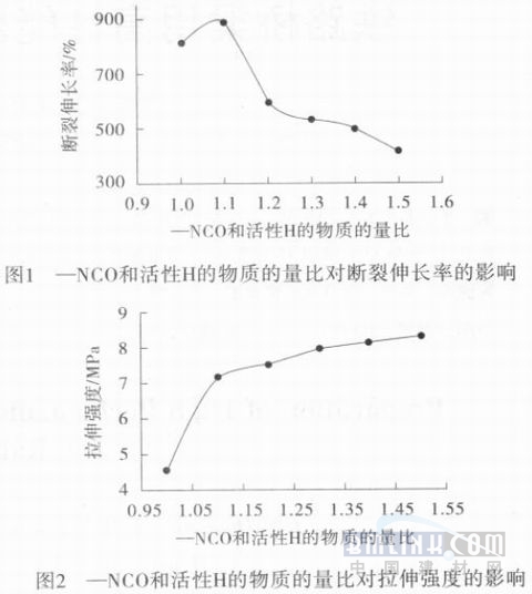 图1、2—NCO和活性H物质的量比对聚氨酯防水涂料性能的影响 由图1、2可以发现断裂伸长率随着—NCO和活性H物质的量比的升高,先升高然后逐渐降低,拉伸强度随着—NCO和活性H物质的量比的升高逐渐升