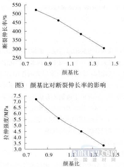 图3、4颜基比的不同对聚氨酯防水涂料性能的影响 由图3、4可以看出随着颜基比的增大,断裂伸长率及拉伸强度逐渐降低。这是因为,一方面,颜填料和基料树脂混合后,形成交联网络和硬段塑料相网络;以小分子状态存在的颜填料将被固定于整个网络之中。