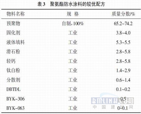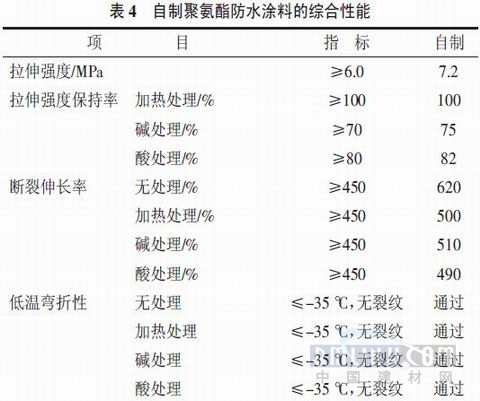 表3聚氨酯防水涂料的较优配方 由较优配方制得的聚氨酯防水涂料综合性能检测结果和铁路桥梁用聚氨酯防水涂料技术标准对比见表4。