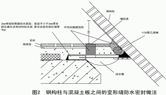 (1)钢结构立柱与混凝土板之间的变形缝部位均用非固化橡化沥青涂料嵌填。其余部位应按(图8)构造进行增强的防水密封处理。