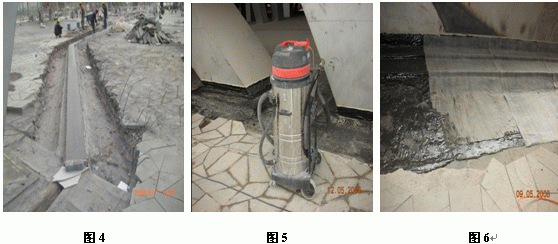1、拆除变形缝区域石材面层与混凝土保护层(图4)。拆除变形缝外侧250mm范围内的卷材防水层及返至立面的卷材防水层。