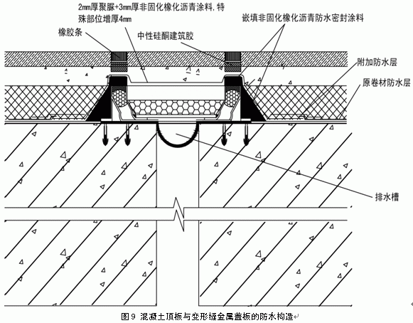 (2)混凝土顶板与变形缝金属盖板处新做防水层在转角部位增加非固化橡化沥青的厚度不小于4mm,以便于满足变形的特殊要求,对盖板连接缝处亦应进行增强的密封处理(图9)。