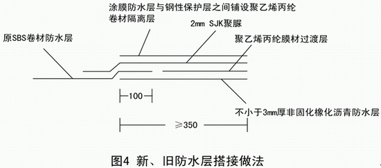 (4)变形缝外侧新作防水层与原卷材防水层的总搭接宽度不应小于350mm,原卷材防水层应直接压在新做的非固化橡化沥青防水层之上,其压接宽度不应小于100㎜(图10)。