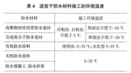 一般防水材料均不宜在低温及负温下施工,否则会影响粘结性能及防水效果。不同防水材料施工的适宜温度见表4。