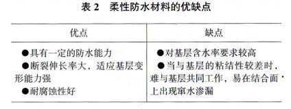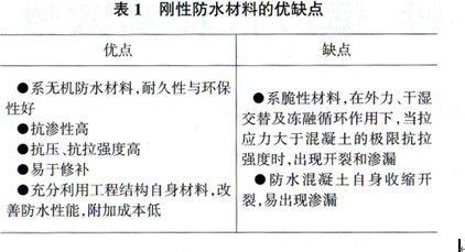 在长期的工程防水实践中,我们认识到刚性防水材料有下列优缺点(表1):